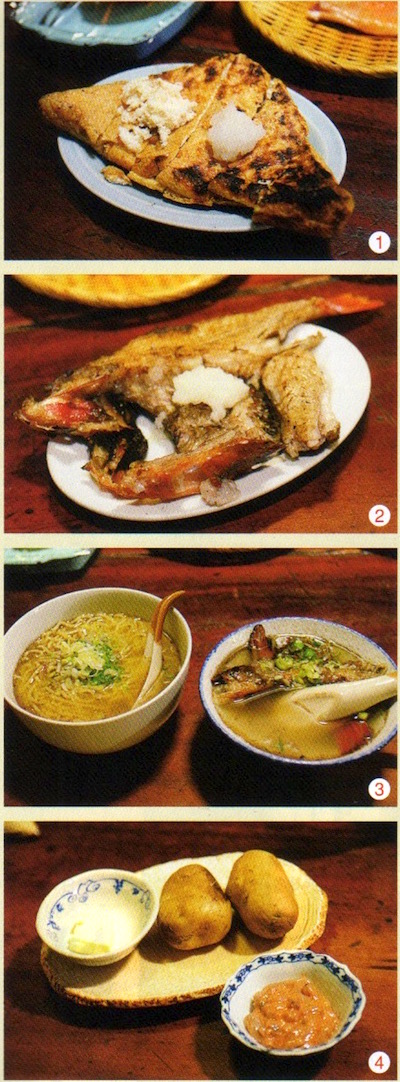 アルコールとともに、オススメのメニューをいただく。写真上から、(1)大きな油揚げの揚げ納豆(山わさびと大根おろし付き)、(2)焼き魚メンメ(きんき)、(3)メンメはサービスで残った骨で特製スープにしてもらえ、ラーメンの麺を入れてくれる、(4)石焼じゃがいも(バターと塩辛付き)。メンメのラーメンと塩辛の石焼じゃがいもが美味しかったなぁ。