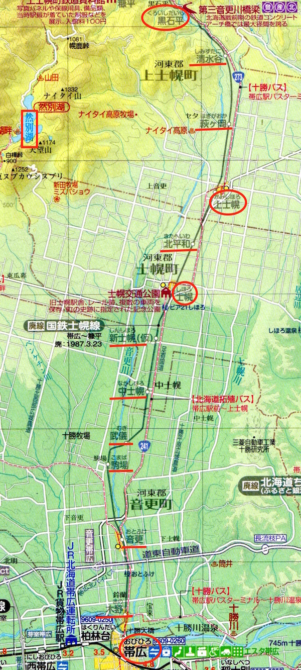 帯広駅をでて、根室本線を左に見ながら走り、右にカーブして広大な十勝川を渡ると木野。音更を過ぎ、右手に清涼飲料水や牛乳の工場を見ながら駒場を過ぎる。そして音更川を渡り武儀(むぎ)、中士幌と進む。次の士幌の西には5000ヘクタールの広大な草地に300頭の牛が草を食む新田牧場がある。この士幌で十勝三股からの始発列車と待ち合わせのため5分停車。北平和を経て次の集落が上士幌。