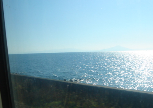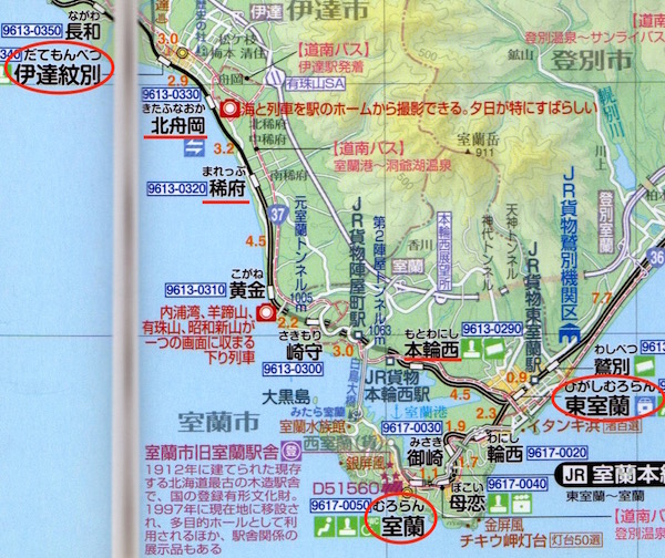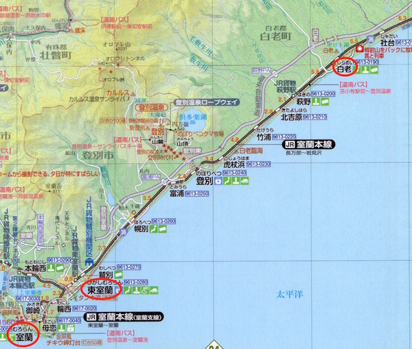 東室蘭からはなだらかで勾配の少ない海岸沿いを北東に向かう。右手には太平洋が広がる。東室蘭を出るとすぐに鷲別。そして幌別川を渡ると幌別である。ほとんど直線で線路が敷かれている。幌別から北東に進んで右に曲がり国道の下をくぐると富浦である。富浦から登別を経て虎杖浜までの間だけが海岸の地形が複雑で断崖が海に迫っている。次は北海道有数の登別温泉への入口の登別。そして海岸へ出ると虎杖浜(こじょうはま)となる。次の竹浦までは一直線で進む。
