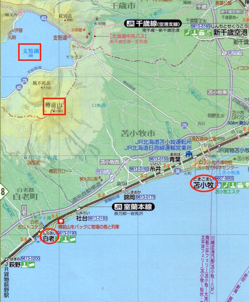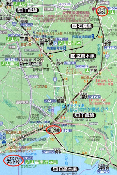 北吉原、萩野を過ぎて白老へ。白老の先でちょっと右に曲がるが、そこから沼ノ端までの18.7kmは直線区間である。社台、錦岡、糸井を過ぎると、市街地に入ってきて苫小牧に着く。