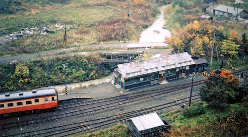 切り通しから築堤にのぼったと思うと、志幌加別川を渡り、山から下りてきた三菱石炭鉱業線が右から大きくカーブして合流すると清水沢である。