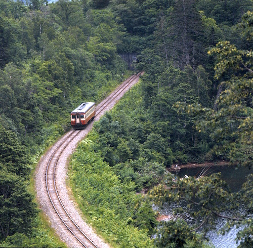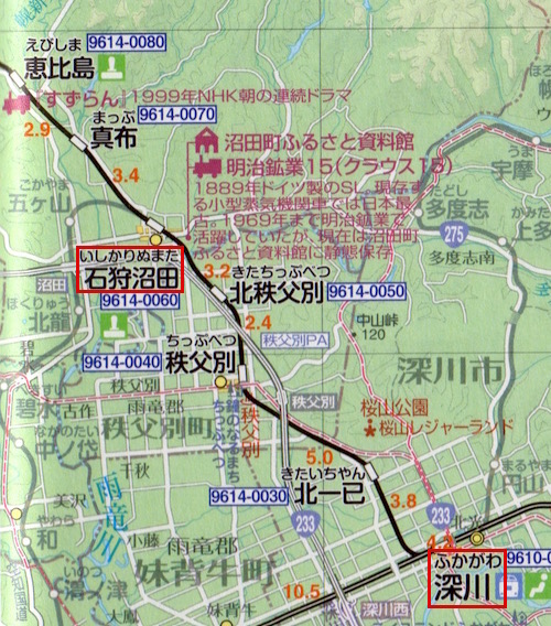 トンネルを出ると今度は25パーミルの下りの急勾配になりブレーキをかけ続けながら下っていき鷹泊へ。ここで朱鞠内行きと列車交換。鷹泊からは深川市内で徐々に平地もみえてくる。