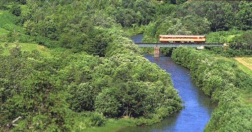 朱鞠内湖を左に見ながら反時計まわりに湖に沿って白樺、蕗ノ台、湖畔仮乗降場に至る。湖畔から雨竜川を渡るとすぐに朱鞠内(しゅまりない)に着く。