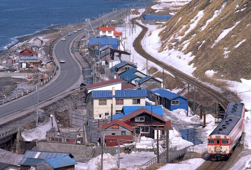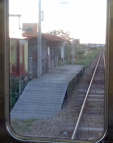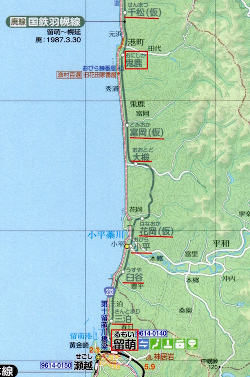 留萌を出ると瀬越臨時乗降場、礼受(れうけ)となる。線路は海岸段丘の段丘崖の裾にへばりつく形で築かれた築堤の上を走っているので、国道と家々の屋根越しに日本海がよく見える。