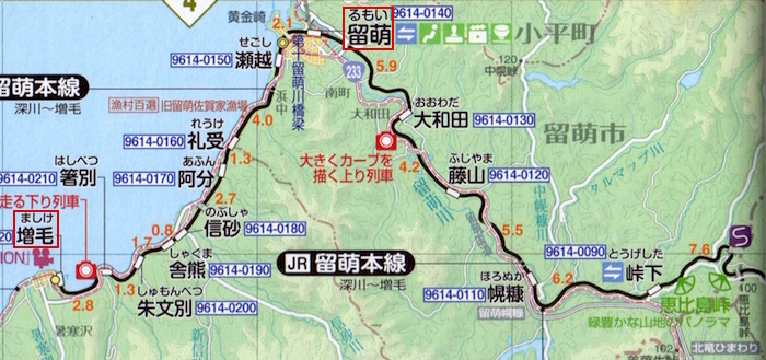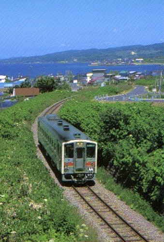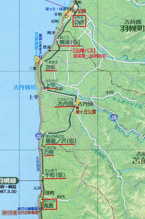 富岡仮乗降場、鬼鹿では、車窓から海岸線を見下ろすと、かつて栄華をきわめたニシン番屋が、大きな木造の御殿風の建物として見える。小平から鬼鹿にかけての海岸は、大正の最盛期には岸に寄って産卵するニシンの群れで一面が白く濁ったと言われている。今となっては、海岸に押し寄せる荒波だけが侘しさを誘う。鬼鹿駅の海岸沿いに鬼鹿温泉もある。ここで普通列車の留萌行きと列車交換する。鬼鹿を出てまもなく、列車の左前方遠くの海に二つの島影が浮かぶ。左が天売島で右が焼尻島だ。