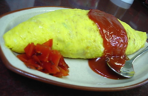 ピーマン入りのチキンライスを丁寧に薄焼き卵でくるんだもので、懐かしいオムライスだ。