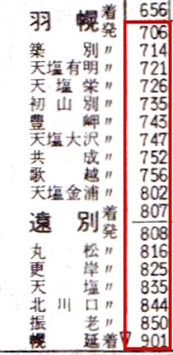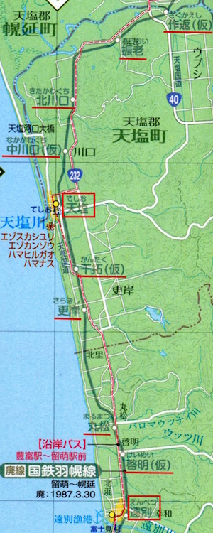 遠別を出ると、啓明仮乗降場、丸松、更岸、干拓仮乗降場まではうら寂しい海岸線を走る。そして久しぶりの集落があるのは天塩。天塩で旭川行きの普通列車(留萌から旭川までは急行るもい2号になる)と列車交換。