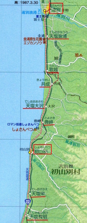 天塩金浦を過ぎるとまとまった集落のある遠別に着く。