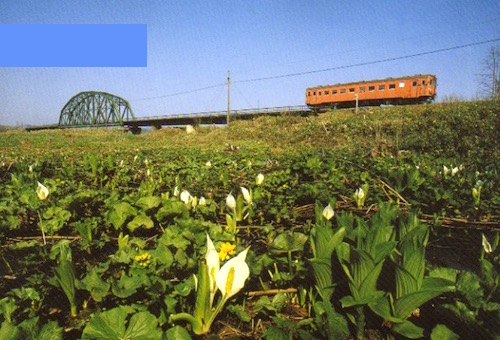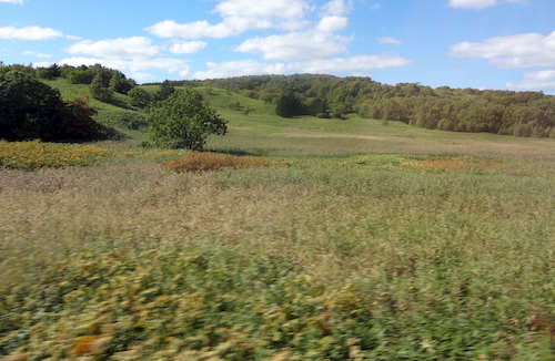 芦川を過ぎると兜沼(かぶとぬま)が近づいてきて、小さな集落がみえると兜沼駅。すぐ左側に兜沼が見える。ここでサロベツ原野は終わる。線路はいったん右にまわって丘陵を越え、また左にまわって北に向かい勇知に着く。なだらかな丘の間を、右に左にまわりながら進んでいくと、草地が開けてくる。日本海は左手の丘の向こう側である。