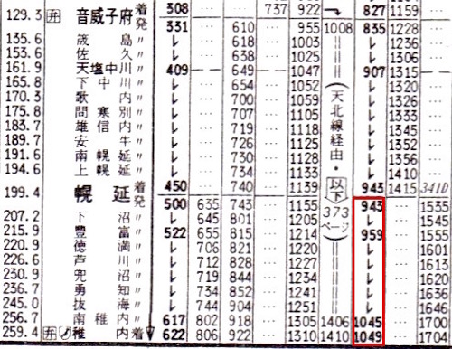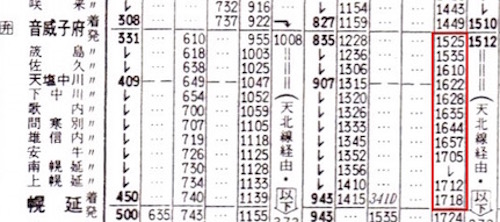 昼食を食べ終えてゆったりしたところで、稚内から天北線経由で札幌行きの急行天北に乗り込む。稚内〜浜頓別にかけては10月12日に通っているので車窓は省略する。途中の鬼志別で普通列車の稚内行きと列車交換した。