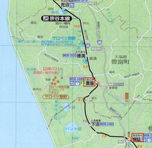 徳満を出てしばらく国道40号と並走するが、原野の北部にさしかかると、サロベツ町が近づいてくる。築堤に登って線路が左に曲がるところで国道に分かれを告げる。