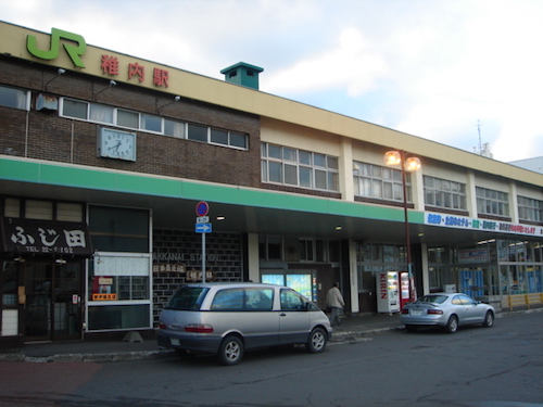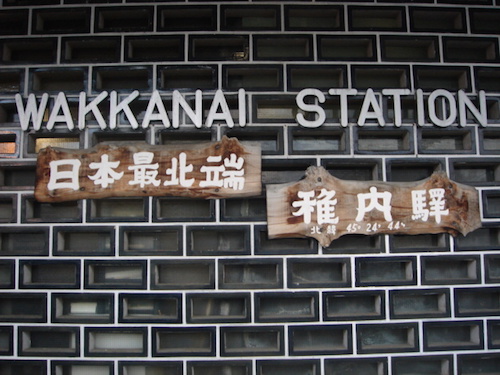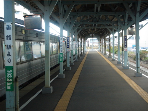市街地の中を高架にのぼり稚内に着く。ホームの柱には、北の最果て駅らしく、「函館駅より703.3km」「札幌駅より396.2km」「東京駅より1596.1km」などと書いてある。
