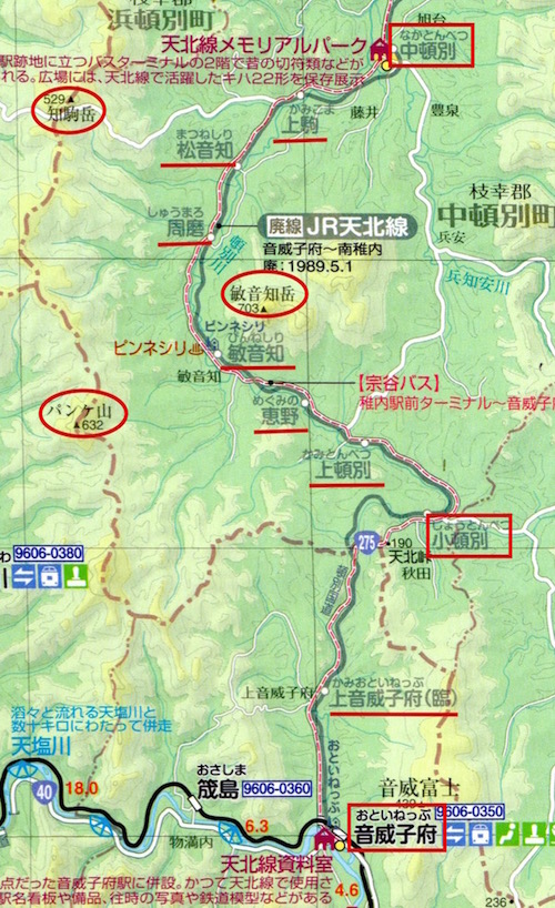 松音知(まつねしり)、周麿(しゅうまろ)仮乗降場、敏音知(びんねしり)、恵野仮乗降場、上頓別は、いずれも山に囲まれたわずかな沢地に酪農家が点在している。