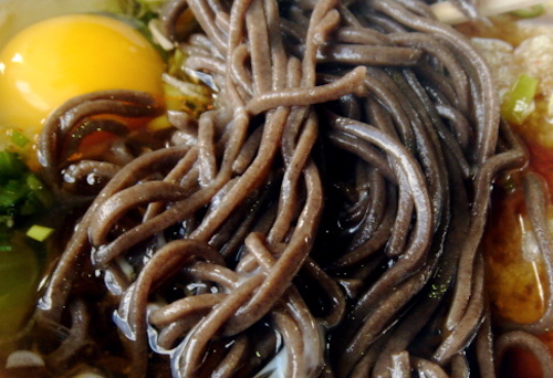 この黒い麺が特徴である。そばの実だけでなく、そばの皮も全て挽いているためにこのような黒い麺になる。おやじさんに「ここのそばが食べたかったんですよ」と声をかけたら照れくさそうな笑顔をみせた。とてもワイルドな駅そばである。