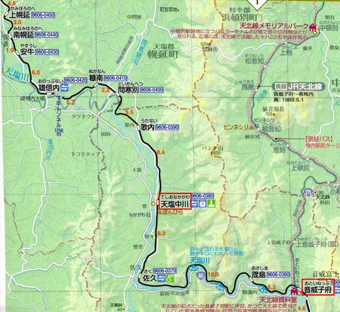さらに登りながら左に大きくカーブして天北峠のトンネルをくぐる。ここからずっと下り勾配になる。上音威子府(かみおといねっぷ)を過ぎると、音威子府川を二度渡り、右からくる宗谷本線と合流してしばらくすると音威子府(おといねっぷ)に着く。