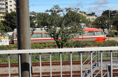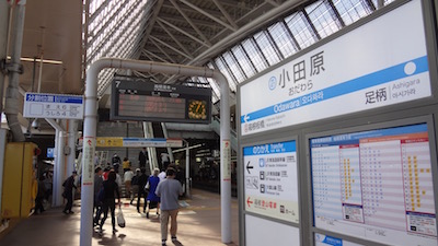 新松田で普通列車の小田原行きに乗り換える。次の開成駅には小田急初の前面パノラマの展望席が設置されたNSE(3100形)のロマンスカーが展示されている。