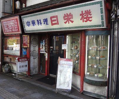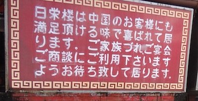 看板には「日栄楼は中国のお客様にも満足頂ける味で喜ばれて居ります。ご家族づれ、ご宴会、ご商談にご利用くださいますようお待ちいたしております。」と書いてある。自信のほどがうかがえる。