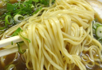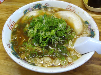 出てきたラーメンは尾道ラーメンの特徴である大きめな背脂がのった、醤油味の魚介ダシのスープ。平麺はもっと太いかと思っていたが、細めの平麺だった。
