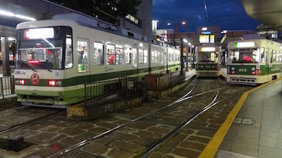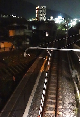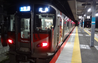 次の新白島(しんはくしま)駅は2015年(平成27年)にできた新しい駅だ。アストラムラインとの接続駅でもある。すでに日は落ちているので車窓は楽しめない。近くにいた若い女の子同士が広島弁で会話をしている。語尾に「けん」をつける言葉が目立つが、きついようにも聞こえるし、また可愛らしくもある。これだけで旅の気分が盛り上がってくる。