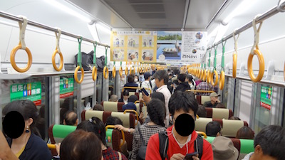 3両(車掌あり、トイレあり)の転換型クロスシートで、車内はかなりの混雑で座ることはできない。