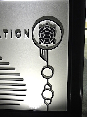 駅前にはおしゃれな駅名標が設置してある。亀をデザインしたマークが使われている。