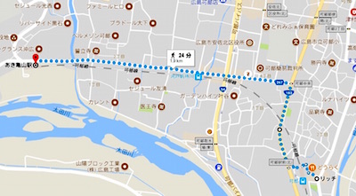 あき亀山駅から今夜宿泊するホテルリッチは可部駅前にあるが、そこまでは歩いて行ってみよう。Google Mapsによると1.9kmで24分と出ている。