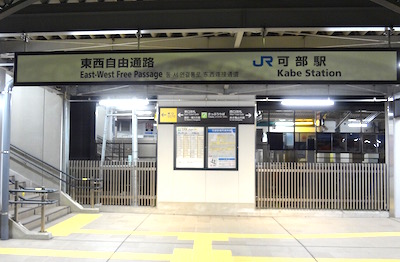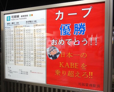 可部駅には、「カープ優勝おめでとう!! 日本一のKABEを乗り超えろ!!」とまじで書いてあった(笑)