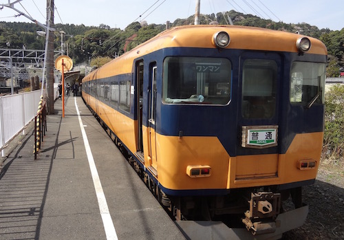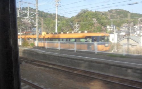金谷駅到着する直前に右手に大井川鉄道の車両(近鉄電車)が見えてきた。