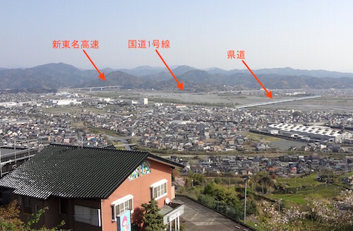 牧之原公園からの眺めは素晴らしい。タクシーを降りて振り返ると、かなりの高台であることがわかる。これはタクシー利用が正解だろう。大井川が眼下に見え、左から新東名高速道路、国道1号線、県道381号線の橋梁が見える。