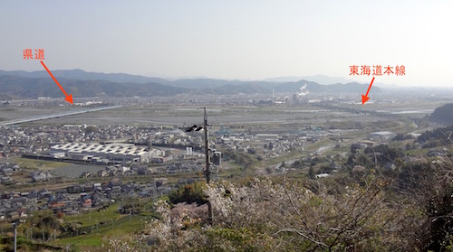 さらに右側には今まで乗ってきた東海道本線の鉄橋が見えている。大井川や金谷・島田の街並みはよく見えるが、霞のようなものがあるため、駿河湾や富士山は見えない。