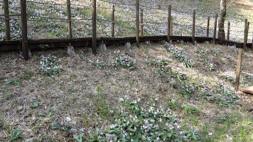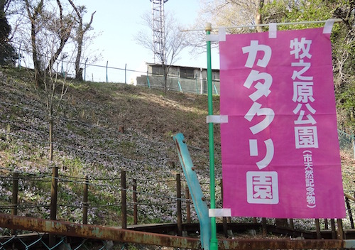 カタクリ園は市天然記念物に指定されている。時間が早く園内には入れなかった。斜面全体にカタクリが咲き始めているのをフェンスの外から眺めることにする。