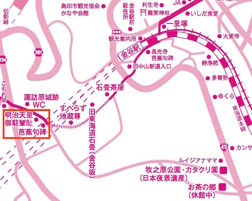 20分くらい歩いただろうか、左手に芭蕉の句碑があった。「馬に寝て 残夢月遠し 茶の烟(けむり)」と書かれている。