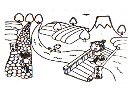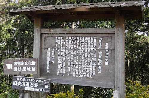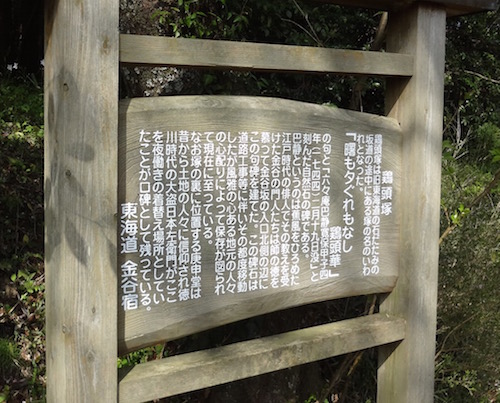 この石畳は、江戸時代幕府が近郷集落の助郷に命じ、東海道金谷宿と日坂宿との間にある金谷峠の坂道を旅人たちが歩き易いように山石を敷き並べたものであると言われています。近年、僅か30メートルを残す以外は全てコンクリートなどで舗装されていましたが、平成三年、町民約600名の参加を得て実施された「平成の道普請」で延長430メートルが復元されました。いま街道の石畳で往時を偲ぶことができるのはこの金谷坂のほか、箱根峠、中山道十曲峠の三箇所だけとなりました。 平成四年三月 島田市教育委員会』