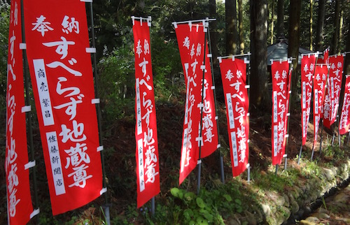 途中にすべらず地蔵尊があった。「安全に・滑らず・転ばず・着実に進めるように」と、商売繁盛、家内安全のほかに合格祈願などを願いお参りする方が多いようだ。平成5年に建立された。