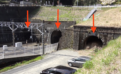 振り返ると昔のトンネルが残っていた。牧の原トンネル(全長1,056メートル)である。一番右に見えるのが現在は使われていないもので、1889年(明治22年)に殉職者を出す難工事の末に開通した初代の東海道本線の牧の原トンネルだ。当時はもっとも長いトンネルであった。真ん中が1903年(明治36年)に開通したトンネルでその時に複線化されている。一番左は1975年(昭和50年)に開通した新牧の原トンネルになる。