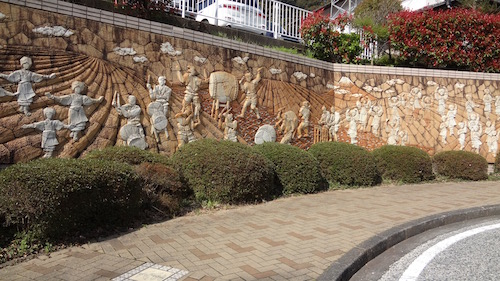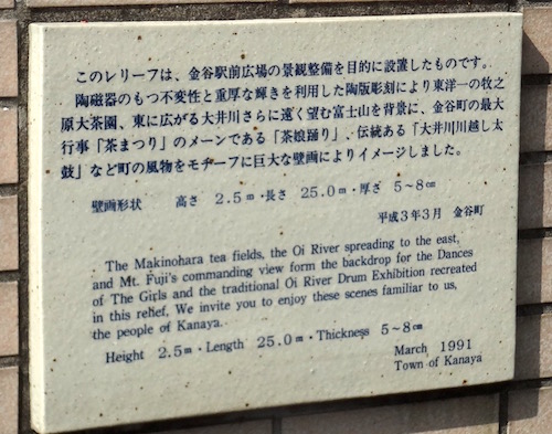 『このレリーフは、金谷駅前広場の景観整備を目的に設置したものです。陶磁器のもつ不変性と重厚な輝きを利用した陶版彫刻により東洋一の牧之原大茶園、東に広がる大井川、さらに遠く望む富士山を背景に、金谷町の最大行事「茶まつり」のメーンである「茶娘踊り」、伝統ある「大井川川越し太鼓」など町の風物をモチーフに巨大が壁画によりイメージしました。壁画形状 高さ 2.5m・長さ 25.0m・厚さ 5〜8cm 平成3年3月 金谷町』
