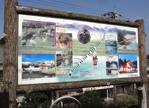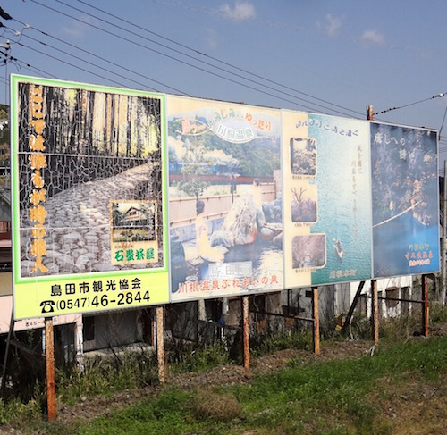 金谷駅は1面1線の終着駅だ。観光案内の大きな看板が目をひく。一部は少し老朽化しているようだ。