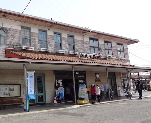 新金谷駅の駅舎を撮影する。この駅舎は大正15年に建てられた木造2階建てで、1階は駅の改札口はカフェなどがあり、2階は大井川鐵道の本社事務所となっている。