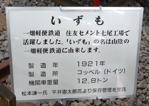 また一畑軽便鉄道や住友セメント七尾工場で活躍したSLいずもが展示してあった。