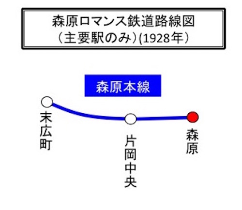 森原ロマンス鉄道の設立は昭和3年(1928年)。森原〜末広町の8駅で営業を始め、これが森原本線です。