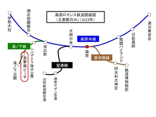 千早松原駅や滝ノ下公園駅が観光客で混雑してきたので、その間に中くらいの規模の美夢麻ビーチ駅を2023年に新設しました。