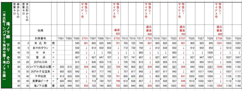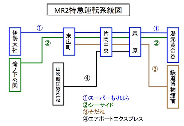 (2)シバザクラ海浜公園駅や美夢麻ビーチ駅などがある滝ノ下線を走る特急を「特急シーサイド」とし、森原本線の区間は「特急スーパーもりはら」と併結して、末広町駅で切り離しや連結することとしました。