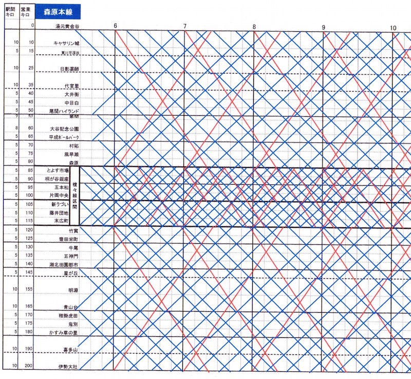 はじめに特急列車を赤い線で書き込み、その後普通列車を青い線で書き込みました。湯元黄金谷駅を5時45分に出発する普通列車は、湯元黄金谷駅を6時ちょうどに出発する特急スーパーもりはらに日影薬師駅で抜かれるのがわかります。