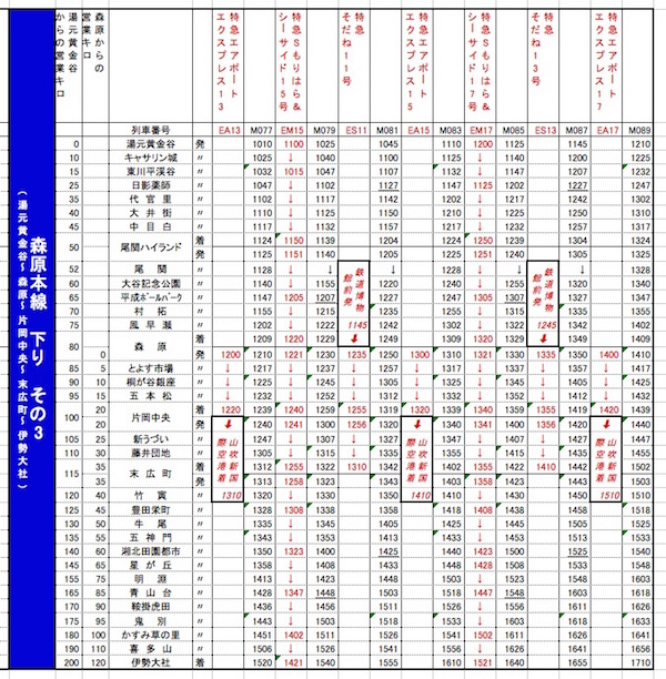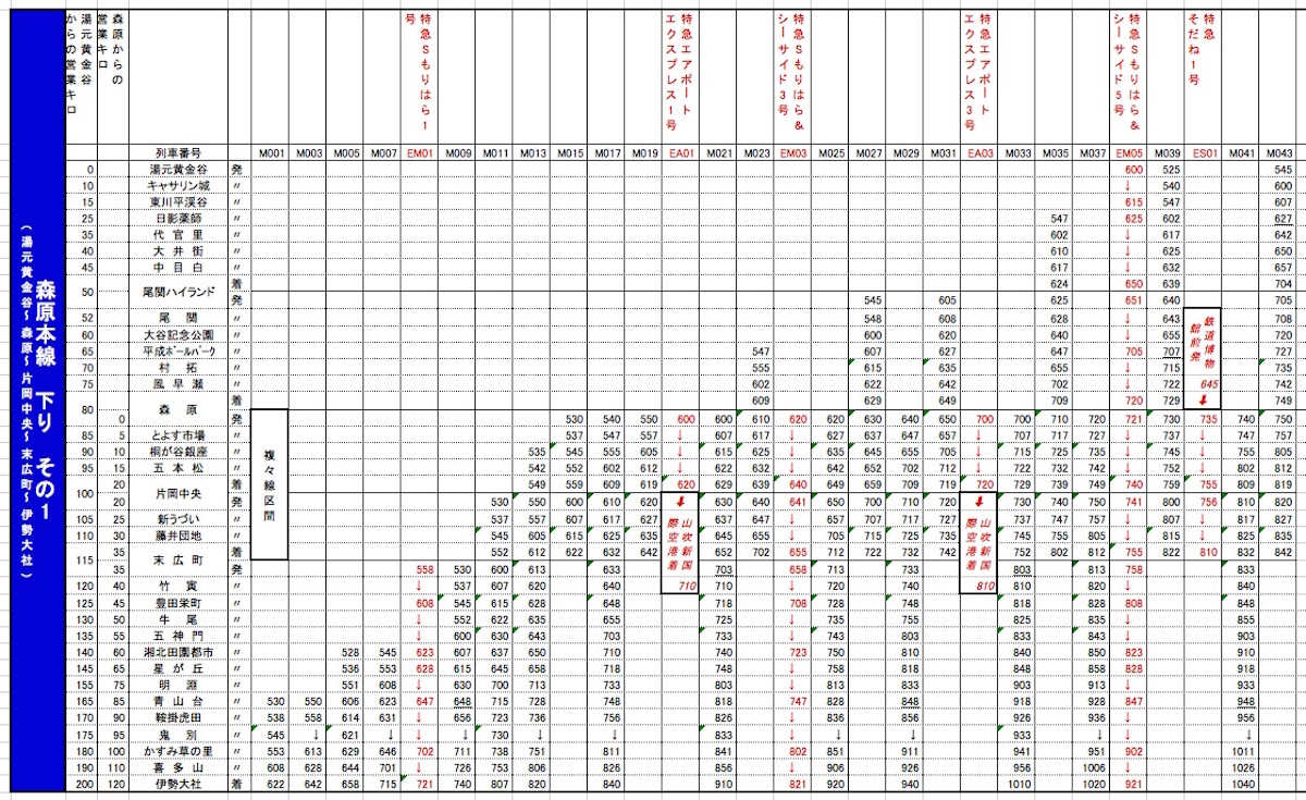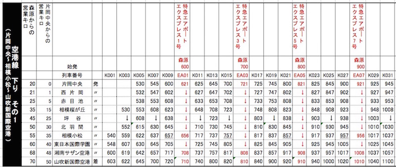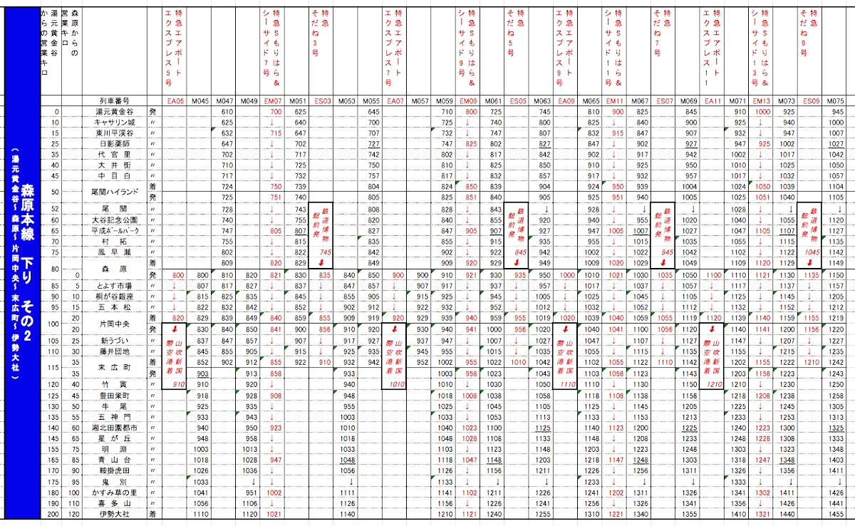 (1)こちらも赤い線が特急エアポートエクスプレス(すべて森原駅発)です。