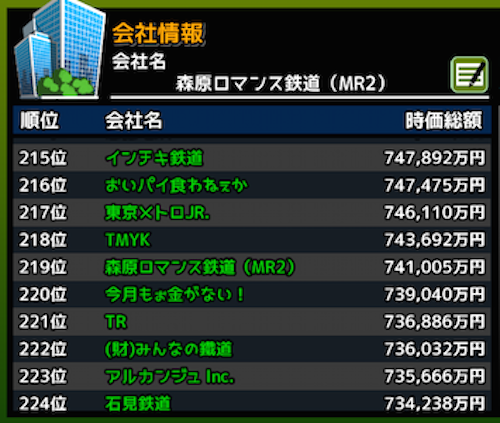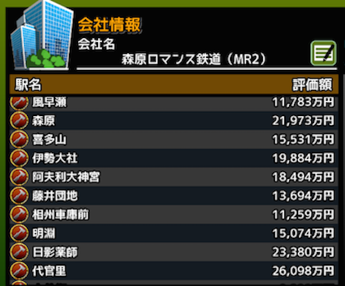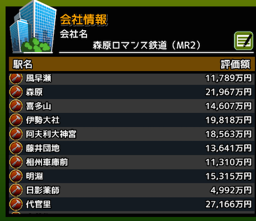 各駅の評価額を見ると日影薬師駅の評価が低い(4992万円)ので中くらいの駅から大きな駅(10両停車可能なホーム)へ拡張しましょう。