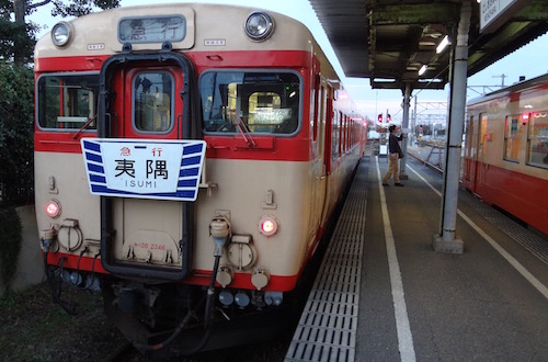 大原駅に到着した。ホームの反対側には急行夷隅(いすみ)が停まっていた。