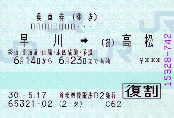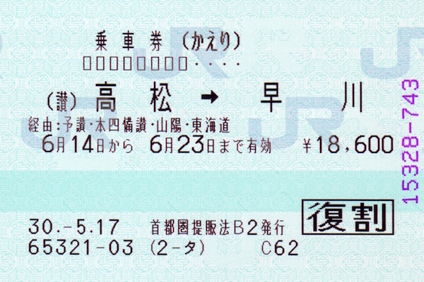 帰りは(横浜ではなく)小田原から小田急線で伊勢原へ向かう予定なので、乗車券は、往路:横浜→岡山→高松、復路:高松→岡山→小田原となる。普通に買うと、