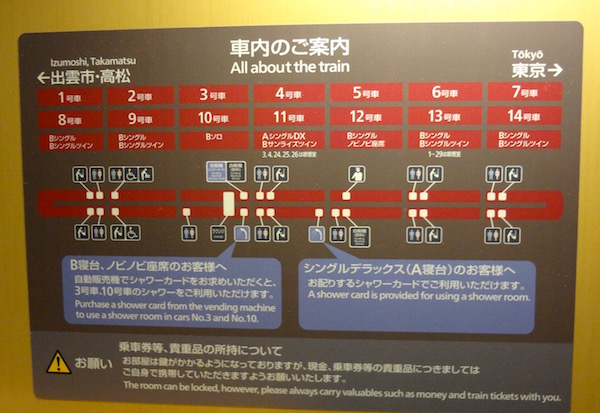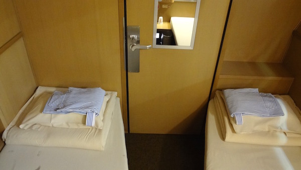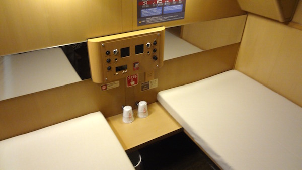 禁煙室がとれずに喫煙可能な部屋だったため消臭スプレーを持参しての乗車となった。ビジネスホテルのツインルームを小さくした感じの部屋である。平日の夜なので、通過する駅のホームには家路を急ぐサラリーマンの姿が目だつ。