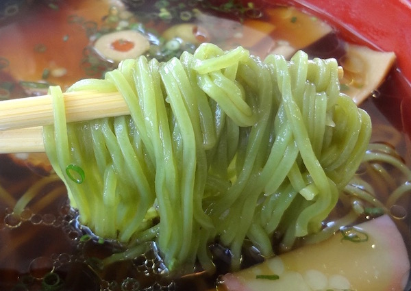 私はオリーブラーメンセット1200。オリーブが麺に練りこまれているので緑色をしている。柔らかく茹でられているのでお年寄りにはいいかもしれない。