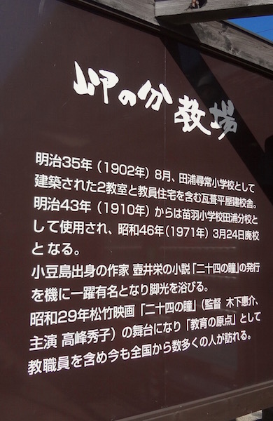 昭和29年松竹映画「二十四の瞳」(監督木下恵介、主演高峰秀子)の舞台になり「教育の原点」として教職員を含め今も全国から数多くの人が訪れる。